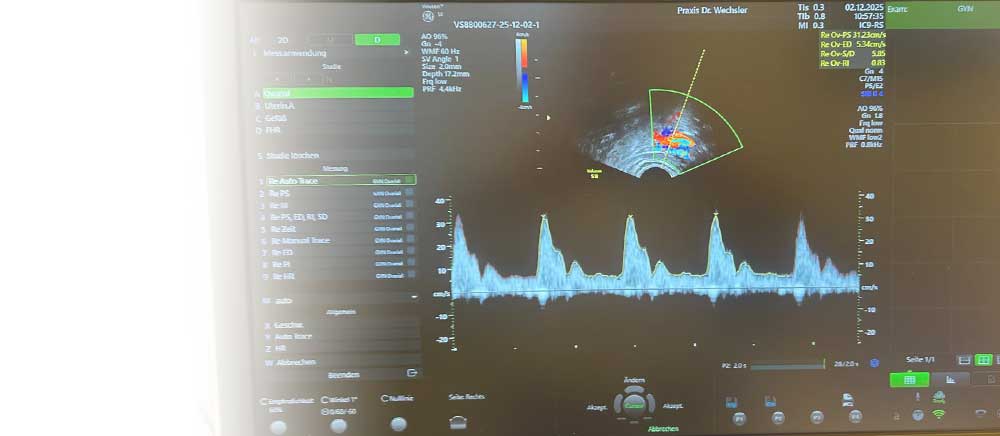 In our joint gynecological practice in Düsseldorf, we, an experienced married couple of doctors, offer state-of-the-art Doppler examinations. Doppler sonography allows us to precisely visualize the direction and velocity of blood flow in the mother’s body and the unborn child. This important examination method provides valuable information about the supply and development of your baby. As gynecologists in Düsseldorf, we place great emphasis on compassionate and individualized care throughout the entire pregnancy. The Doppler examination is an essential component of our comprehensive prenatal care.